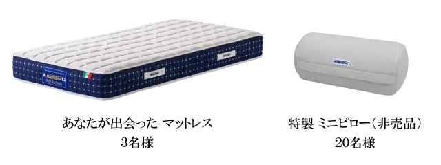 ◆所要時間:1分程度 わたし meets Magniflex マニフレックス体験キャンペーン ■期間■ 2026年4月3日(金)~ 4月19日(日) ■応募方法■ 以下のアンケートフォームより、店頭にてお試しいただいて “最も気に入ったマニフレックスマットレス” を一つお選びください。 応募いただいたお客様の中から、抽選であなたが出会ったそのマットレス、または特製ミニピロー(非売品)をプレゼントいたします。 ※重複応募は無効となります。 ※「ご住所」はお届けを希望されるご住所をご入力ください。 ※応募完了後、「わたし meets Magniflex マニフレックス体験キャンペーン」応募完了メールが届きます。 完了メールが届かない場合は、応募が無効となりますのでご注意ください。 ■賞品■ ・あなたが出会ったマットレス 3名様 ・特製ミニピロー(非売品) 20名様 ■抽選結果■ 当選結果は、2026年4月22日(水)までにメールでのご連絡をもって発表に代えさせていただきます。