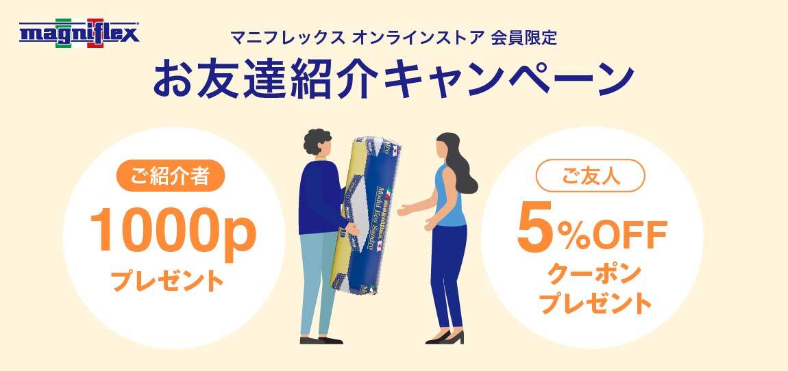 ※会員登録のみでご購入履歴がない場合、本キャンペーンはご利用になれません。 【会員様限定】 ご紹介いただいた「ご友人」には最初のお買い物でご使用いただける【5%OFFクーポン(20,000円以上購入)】を ご登録いただいたメールアドレスにお送りいたします。 会員様にはご紹介いただいた「ご友人」がマニフレックス対象店舗でお買い物をされた日の翌日以降 (一週間以内)に 【1000ポイント】プレゼントいたします。 【注意事項】 ※会員登録のみでご購入履歴がない場合、本キャンペーンはご利用になれません。 ※お友達には必ずこのキャンペーンの趣旨を事前にお伝えください。 ※対象店舗で既に購入履歴・会員登録があるお客様のご紹介は対象外となります。 ※本キャンペーンの利用には会員登録が必要となります。 ※キャンペーンクーポンは期限内にご使用ください。 ※キャンペーンクーポンは20,000円以上購入でご利用いただけます。 ※キャンペーンクーポンは他クーポンと併用出来ません。 ※会員様へはお友達が対象店舗にて商品をご購入された場合に1000ポイントが付与されます。 ※申し込みに虚偽の入力・不正があった場合、キャンペーンは対象外となります。 ※クーポンが届かない場合はご紹介する側の会員様よりご連絡ください。